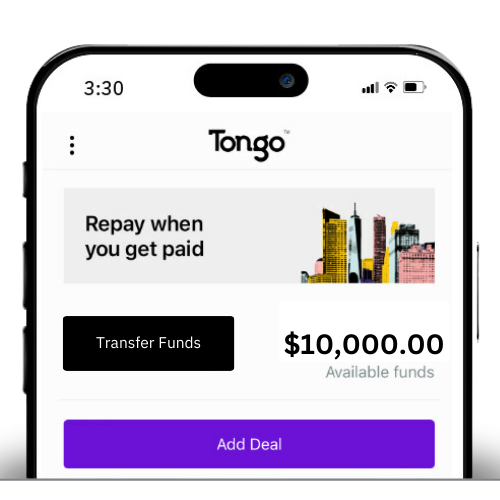 Use your approved line of credit by instantly transferring funds to your checking account or by making purchases with the Tongo card. Either way fees are as low as 3% per 30 days. Come back to your line of credit as many times as needed before a deal closes.